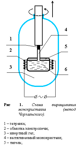 Схема процесса изображена на рис 1. В расплавленное нагревателем вещество, которое находится в тигле и имеет температуру, близкую к температуре плавления, опускают монокристаллическую затравку того же состава, что и расплав. Далее приводится в действие механизм подъема и вращения затравки; при этом затравка смачивается расплавом и увлекает его вверх, вследствие чего расплав на затравке нарастает в виде кристаллической фазы. Метод обеспечивает получение полупроводникового материала в форме совершенных монокристаллов с определенной кристаллической ориентацией и минимальным числом дефектов. Нагреватель может быть резистивным, высокочастотным, электронно-лучевым.