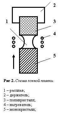На рис 2 показана схема безтигельной вертикальной зонной плавки. Достоинством метода является совмещение процесса глубокой очистки полупроводника с последующим выращиванием его монокристалла. Отливка в форме стержня из предварительно очищенного и легированного поликристаллического полупроводника прикрепляется одним концом к затравочному кристаллу. Небольшая зона контакта на границе затравочного кристалла разогревается до температуры плавления полем высокой частоты или электронным пучком и медленно сдвигается к противоположному концу стержня. На затравочной стороне происходит отвердение кремния в виде монокристалла. Как уже было сказано, большинство примесей обладают хорошей растворимостью в жидкой фазе по сравнению с твердой. Поэтому по мере продвижения зона плавления все больше насыщается примесями, которые по завершении процесса концентрируются на конце слитка. Обычно процесс зонной плавки повторяют несколько раз, по окончании очистки загрязненный конец слитка отрезают.