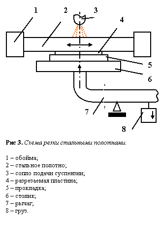 На рис 3 показана схема резки стальными полотнами или наборами полотен с использованием абразивной суспензии. Этот метод применяется в лабораторных условиях для сквозного разделения пластин и подложек. Метод не обеспечивает высокой производительности и качества. Точность размеров кристаллов невысокая из-за неравномерности натяжения полотен в обойме, их вибрации, неравномерности износа. Абразивная суспензия загрязняет структуры.