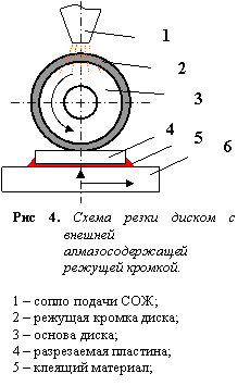 Резание диском с наружной алмазной кромкой обладает по сравнению с процессом резания диском с применением абразивной суспензии более высокой производительностью и позволяет разделять толстые, а следовательно большого диаметра, пластины, обеспечивает воспроизводимые размеры и форму кристаллов и плат со строго вертикальными боковыми гранями, а также большой выход годных структур, достигающий 98 ¸ 100 %. Схема процесса изображена на рис 4.