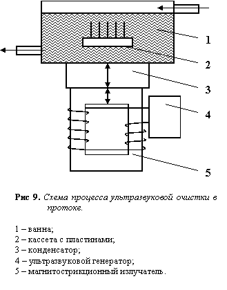 В жидкости возникают вихревые акустические потоки с высокими скоростями, которые интенсивно перемешивают жидкость, а также упругие волны (сгустки и разрежения за счет смещения частиц жидкости). В местах разрежения жидкости появляются кавитационные пузырьки. Под действием сил, которые стремятся вернуть смещенные частицы в исходное положение, эти пузырьки после кратковременного существования захлопываются. При интенсивных колебаниях и захлопывании кавитационных пузырьков возникают ударные волны, сообщающие большие ускорения молекулам жидкости, которые с силой ударяются о поверхность обрабатываемых пластин и сбивают с них частицы загрязнений. Благодаря кавитации жидкость способна проникать в глубокие поры, каналы, углубления, которые при обычных методах остаются неочищенными.