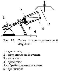 Обезжиренные пластины подвергаются окончательной обработке – полировке. Чаще всего используется химическая полировка (травление), т.е. по существу растворение поверхностного слоя полупроводника в тех или иных реактивах. Обязательными компонентами таких реактивов являются окислитель (обычно азотная кислота) и растворитель образующегося окисла (обычно плавиковая кислота. Кроме этих компонентов в состав травителей входят ускорители и замедлители реакции. Выступы и трещины на поверхности стравливаются быстрее, чем основной материал, и в целом поверхность выравнивается. Чтобы раствор не застаивался у поверхности травления, применяется динамическое травление, т.е. вращение ванны во время процесса (рис 10)
