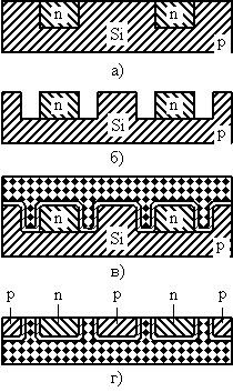 б) Необходимо отметить, что эпик-технология требует прецезионной механической обработки, которая затруднена из-за наличия прогиба подложки в результате различия коэффициентов температурного линейного расширения монокристаллического и поликристаллического кремния и оксида кремния. Различие микротвердости этих материалов приводит к наличию ступенек на поверхности, что затрудняет получение качественной металлизации. С целью устранения отмеченных недостатков разработаны технологические процессы, в которых вместо поликристаллического кремния для изолирующих областей и основания кристаллов используют стекло, ситалл или керамику, т.е. проводят изоляцию диэлектрическим материалом. Такие процессы имеют общее название «кремний в диэлектрике» (КВД). У них много общего с обычным эпик процессом. Отличие состоит в том, что сначала фор