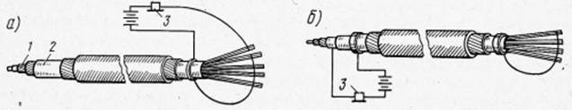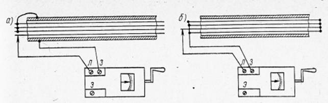 Разделку кабеля для измерений при помощи мегомметра производят так же, как и при измерении сообщения жил между собой и обрыва жил. При измерении изоляции жилы (рис. 2, а) один проводник, присоединенный к выводу Л мегомметра, соединяют с испытываемой жилой, а другим проводником соединяют вывод 3 с металлической оболочкой или с остальными жилами, соединенными между собой (у кабелей с пластмассовой оболочкой). Вращая ручку мегомметра с частотой около 130 об/мин, по его шкале отсчитывают величину сопротивления изоляции жилы. В зависимости от типа мегомметра им можно измерять величину сопротивления изоляции до 500-1000 МОм. При испытании мегомметром жил на обрыв (рис. 2, б), если проверяемая жила не - имеет обрыва, то при вращении ручки мегомметра стрелка его прибора будет оставаться на нуле. При обрыве стрелка отклонится влево, указывая величину большого сопротивления, что будет свидетельствовать о наличии обрыва жилы.