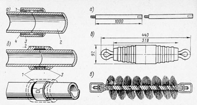 Перед протягиванием кабеля в канализации предварительно проверяют состояние ее каналов. Для этого от одного колодца до другого при помощи свинчивающихся дюралюминиевых палок (рис. 4, а) протягивают стальной трос, а затем при помощи троса пробный цилиндр (рис. 4, б) и стальную щетку (рис. 4, в), чтобы выровнять и сгладить стенки каналов в местах стыка труб и очистить полость труб от сора.