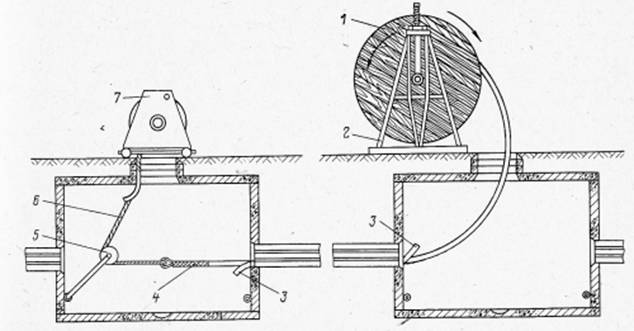 Кабель протягивают в канализации по участкам между смежными колодцами, для чего над одним из колодцев устанавливают на козлах 2 (рис. 5) барабан 1 с кабелем, а у соседнего колодца - ручную или моторную лебедку 7, затем трос 6, протянув через канал трубопровода и пропустив его через блок 5, скрепляют с концом кабеля при помощи стального кабельного чулка 4 и, вращая ручку лебедки, протягивают кабель по каналу. Для того чтобы кабель не повредился о края трубопровода, на входе и выходе трубопровода устанавливают кабельное колено 3 или втулку. Для уменьшения тяговых усилий поверхность свинцовой оболочки кабеля при его протягивании смазывают техническим вазелином. Кабели в пластмассовой оболочке смазывать вазелином нельзя и оболочку таких кабелей при протягивании смачивают водой. До и после протяжки кабеля его испытывают. В колодцах оставляют запас кабеля, необходимый для монтажа соединительных и разветвительных муфт и укладки кабеля по стенам колодца.