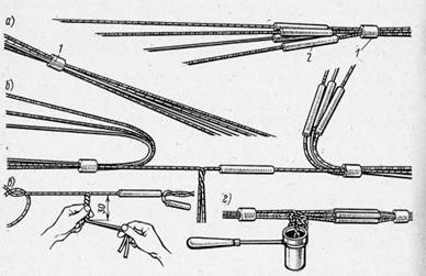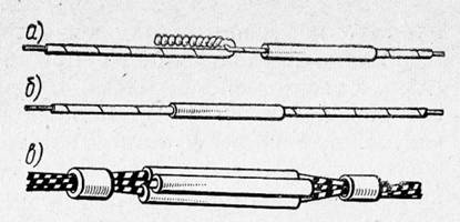 Подготовленные скрутки жил смачивают на длине 15-20 мм раствором канифоли и запаивают припоем ПОС-40. При запайке удобно пользоваться паяльником в виде стаканчика (рис. 11, г) с расплавленным припоем. Запаянную скрутку жилы в четвертке отгибают в сторону, противоположную надетой гильзе (рис. 12, а), а затем надевают гильзу на скрутку (рис. 12, б). Изолированные таким образом жилы складывают вместе с обеих сторон и придвигают групповые кольца (рис. 12, в).