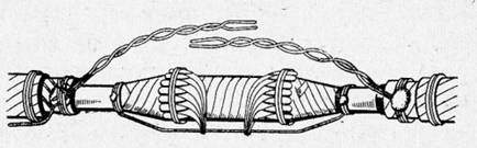 муфтах; называемых конденсаторными, производят симметрирование кабельных цепей при помощи включения между жилами, а также между жилами и землей симметрирующих конденсаторов.Если конденсатор должен быть включен между жилами в четвертке, то его проводники припаивают к соответствующим жилам. При включении конденсатора между какой-либо жилой и землей (оболочкой кабеля) один его проводник припаивают к жиле, а второй -к проводнику , соединяющему металлические оболочки обоих концов кабеля. После того как присоединение всех конденсаторов закончено кабельная скрутка просушена и обвернута кабельной бумагой, конденсаторы укладывают по окружности сростка и плотно закрепляют суровой ниткой.
