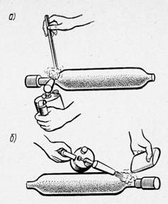 Качество запайки муфты проверяют также сжатым воздухом. Для этой цели в корпус муфты впаивают вентиль, к которому присоединяют насос или баллон со сжатым воздухом, создаютв муфте давление впределах до 9,8-104 Па, при этом муфту и все места смачивают мыльной водой и по отсутствию пузырьков воздуха, выходящих из муфты, судят о доброкачественности ее запайки. После проверки герметичности муфты вентиль выпаивают, а образовавшееся в муфте отверстие запаивают.