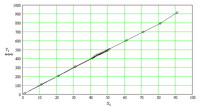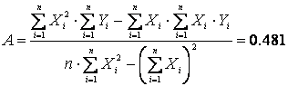 Рассчитаем число серий в полученной последовательности N=8. Задавшись доверительной вероятностью P=0.95 для n=20 определяем по соответствующим таблицам допустимые границы N1-0.5a =6 и N0.5a=14. Рассчитаем количество инверсий в данной последовательности А=79. Задавшись доверительной вероятностью P=0.95 для n=20 определяем по соответствующим таблицам допустимые границы А1-0.5a =64 и А0.5a=125. Так как N1-0.5a < N ≤ N0.5a и А1-0.5a < A ≤ А0.5a следовательно с доверительной вероятностью P=0.95 можно считать, что отклонения экспериментальных значений Y от соответствующих расчетных значений являются случайными. То есть расчетное уравнение регрессии достоверно описывает экспериментально исследованную зависимость.
