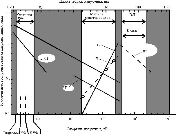 Рис. 11. Наименьшая воспроизводимая ширина линии : I - дифракционный предел (зазор 10 мкм); II - дифракционный предел (NA объектива равна 0.4); III - дифракционный предел (зазор 1 мкм); IV и V - предел рассеяния фотоэлектронов, теоретические значения и данные эксперимента соответственно; VI - предел, определяемый обратным рассеянием электронов.