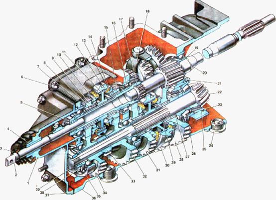 Картер коробки передач представляет собой блочную конструкцию, разделенную перегородками на три секции. В первой секции со стороны маховика размещена главная передача. Во второй секции размещены зубчатые колеса первой и второй передач и зубчатые колеса заднего хода, а в третьей секции — зубчатые колеса третьей и четвертой передач. Первая и вторая секции сообщаются между собой и имеют общее отверстие для слива масла, закрытое пробкой с вклеенным постоянным магнитом для сбора металлических частиц, попавших в масло. Третья секция сообщается с полостью задней крышки и также имеет отверстие для слива масла, закрытое такой же пробкой. В третьей секции между зубчатыми колесами третьей и четвертой передач установлено зубчатое колесо привода спидометра. В передней части картера коробки передач крепится картер сцепления, к задней — задняя крышка. Посадочные места картера коробки передач обработаны совместно с картером сцепления, поэтому они заменяются в комплекте.
