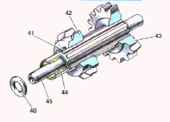 Ось шлицевого вала заднего хода запрессована в отверстия передней и средней стенок картера и дополнительно удерживается усом крышки, входящим в паз на переднем конце оси. Диаметр переднего конца оси на 27 мм больше диаметра остальной части на 0,04 мм. Соответственно увеличено и отверстие в передней стенке картера, что облегчает сборку и разборку узла.