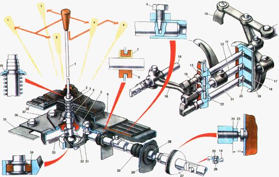 1 — задняя крышка; 2 — шток ползуна; 3 — уплотнитель; 4 — задняя втулка;5 — передняя втулка; 6 — крышка картера; 7 — прокладка; 8 — втулка; 9 — ведущая шестерня четвертой передачи; 10 — шайба; 11 — ступица; 12 — муфта третьей и четвертой передач; 13 — игольчатый подшипник; 14 — кольцо блокирующее; 15 — шестерня третьей передачи; 16 — подшипник роликовый; 17 — промежуточный вал; 18 — рычаг; 19 — стопорное кольцо; 20 — ведущий вал коробки передач; 21 — крышка; 22 — ведущая шестерня (ведомый вал) главной передачи; 23 — крышка переднего подшипника; 24 — маслосливная пробка; 25 — регулировочная прокладка; 26 — упорный подшипник ведущей шестерни; 27 — регулировочная прокладка; 28 — ведомая шестерня первой передачи; 29 — шайба; 30 — ведомая шестерня заднего хода; 31 — ведомая шестерня второй передачи; 32 — ведомая шестерня третьей передачи; 33 — ведущая шестерня привода спидометра; 34 — ведомая шестерня четвертой передачи; 35 — задний подшипник ведущей шестерни; 36 — картер коробки передач; 37 — прокладка; 38 — шайба; 39 — гайка; 40 — шайба; 41 — шлицевой вал ведущей шестерни заднего хода; 42 — промежуточная ведущая шестерня заднего хода; 43 — промежуточная ведомая шестерня заднего хода; 44 — втулка оси; 45 — ось шлицевого вала; 46 - сухарь; 47 — пружина; 48 — заглушка; 49 — ведомая шестерня привода спидометра; 50 — уплотнитель; 51 — ведущая шестерня; 52 — вал; 53 — корпус редуктора; 54 — шестерня; 55 — ведомый вал. Схема работы синхронизатора: а — нейтральное положение передач; б — начало