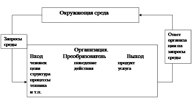 Организация как единый организм, имеющий вход, преобразователь и выход, взаимодействуя с внешним окружением определенным образом, соответствующим характеру и содержанию этого взаимодействия, включает человека как элемент организации в процесс организационного и материального обмена между организацией и средой. В данной модели человек рассматривается как составная часть входа и выступает в роли ресурса организации, который она, наряду с другими ресурсами, использует в своей деятельности.