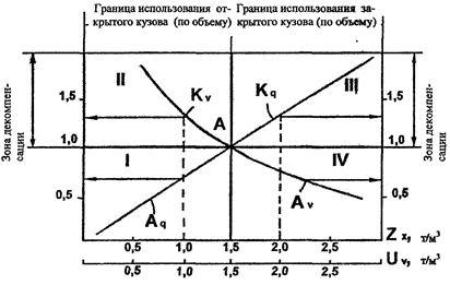 При перевозке грузов с объемной массой от 0 до 1,5 т/м3 (I квадрат) пороговый коэффициент теоретически может изменяться от 0 до 1,0 (рис. 3.1). Если же в данном кузове перевозятся грузы с объемной массой, например, 1,0 т/м , то при полном использовании объема кузова Ад составит 0,7, т. е. грузоподъемность автотранспортного средства реализуется на 70 % . Для повышения реализации грузоподъемности до 100 % объем кузова теоретически должен быть увеличен (II квадрат) на 30 %, при этом коэффициент увеличения объема (Ку), будет равен 1,3 (зона декомпенсации). На практике это означает, что увеличение геометрического объема открытого кузова возможно путем наращивания бортов или установки стоек.