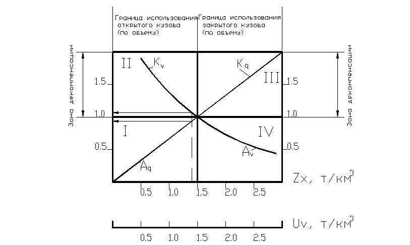 При перевозке грузов с объемной массой от 0 до 1,5 т/м3 (I квадрат) пороговый коэффициент теоретически может изменяться от 0 до 1,0 (рис. 1.1). Если же в данном кузове перевозятся грузы с объемной массой, например, 1,4 т/м3 , то при полном использовании объема кузова Ад составит 0,92, т. е. грузоподъемность автотранспортного средства реализуется на 92 % . Для повышения реализации грузоподъемности до 100 % объем кузова теоретически должен быть увеличен (II квадрат) на 8 %, при этом коэффициент увеличения объема (Ку), будет равен 0.8 (зона декомпенсации). На практике это означает, что увеличение геометрического объема открытого кузова возможно путем наращивания бортов или установки стоек.
