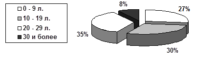 1. Время работы в данной организации. Большинство работников исследуемой организации работают в ней довольно продолжительное время. В сумме от 10 до 30 и более лет в данной организации работает 73% опрошенных. Менее 5 лет работают лишь 7 человек, то есть 19%.