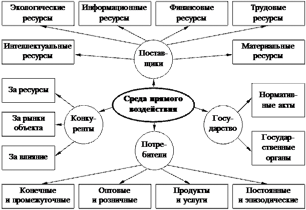 К среде прямого воздействия относятся поставщики, потребители и конкуренты, а также государственные органы и правовые нормы, непосредственно влияющие на деятельность организации.