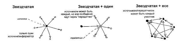 В информационном слое связи между участниками означают передачу информации от одного участника к другому. Но в отличие от коммуникационного слоя эта связь устанавливается не между двумя участниками, а между одним и несколькими (возможно, всеми другими) участниками сети. Связи между участниками сети могут иметь звездчатую, или «звездчатую плюс один», или «звездчатую плюс все» структуру (см.: рисунок 2).