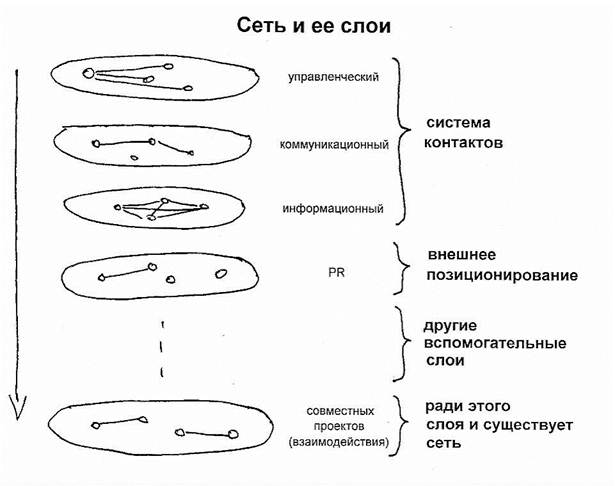 К вышеприведённым слоям сетевых структур необходимо добавить ещё слои деятельности сети, выраженные в отдельных коммуникациях и функционально-деятельных взаимосвязях: