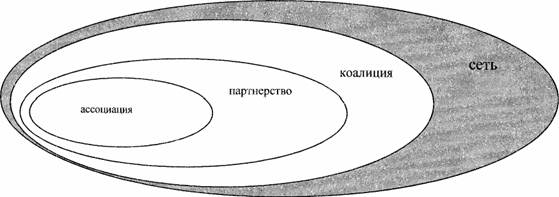 В зависимости от того, какие типы связей превалируют на определенном слое и в какой степени участники сети связаны с другими можно выделить четыре типа сетевых структур (см. рисунок 4): простая сеть, коалиция, партнерство и ассоциация. Все они являются сетевыми. Каждый из них является частным случаем предыдущего, как показано на рисунке. Таким образом, ассоциация - это разновидность партнерства, партнерство - коалиции, а коалиция - частный случай простой сети.