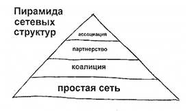 Причем в одной и той же сети, в разных ее слоях может наблюдаться та или иная сетевая структура. Подразумевается также, что к участникам структуры в каждом слое относятся только те, кто связан с другими. В общем случае простая сеть является охватывающей всех участников, базой для формирования других слоев с более сильными связями, в которых участвует, как правило, меньше организаций, чем участников во всей сети. Структура с более сильными взаимодействиями вложена в структуру, где используются более слабые взаимодействия и взаимосвязи. Это еще может быть представлено пирамидой (см. рисунок 5).