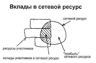 Сетевой ресурс не представляет собой механическую сумму ресурсов участников. Здесь количество должно переходить в качество. С одной стороны он меньше, поскольку участники не предоставляют в распоряжении сети свои ресурсы полностью. С другой стороны, он шире, поскольку объединение в сеть ее участников создает нечто новое (см. рисунок 6).