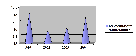 Для анализа соотношения доходов населения России зачастую используется расчет децильного коэффициента, который считается индикатором социальной напряженности в стране и представляет собой отношение долей в совокупных доходах населения 10% самых богатых граждан к доходам 10% самых бедных. Иными словами, во сколько раз доходы самой богатой части населения больше доходов самой бедной. Верхняя граница значения децильного коэффициента в развитых странах равняется 7-8 разам, а приближение к 10 считается социально опасным ( Рис.2), в России на 2005 г. по данным Росстата коэффицент децильности составляет более 14 %, что характеризует социальную обстановку в стране, как критическую.
