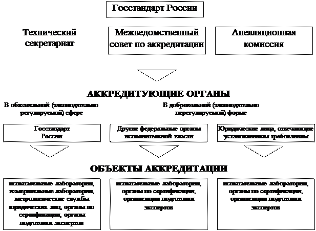 Развитие деятельности по сертификации в промышленной сфере отечественной экономики создало предпосылки и обусловлю необходимость создания свода правил по аккредитации различных объектов (органов по сертификации, испытательных и измерительных лабораторий). В этих целях был сформирован комплекс требований, применяемых в РФ к системам аккредитации объектов, осуществляющих оценку соответствия, включая испытания, измерения и сертификацию в обязательной (законодательно регулируемой) и добровольной сферах. В настоящее время Российская система аккредитации (РОСА) регламентирована комплексом государственных стандартов. В этих стандартах реализованы положения законов РФ "О защите прав потребителей", "О сертификации продукции и услуг", "Об обеспечении единства измерений" в части аккредитации испытательных и измерительных лабораторий, органов по сертификации, а также руководств ИСО/МЭК 55, ИСО/МЭК 38, ИСО/МЭК 40, европейских стандартов Е серии 45000 и работ Международной конференции по аккредитации испытательных лабораторий (ИЛАК). Объектами аккредитации в рамках этой системы определены(ГОСТ 51000.1-95):