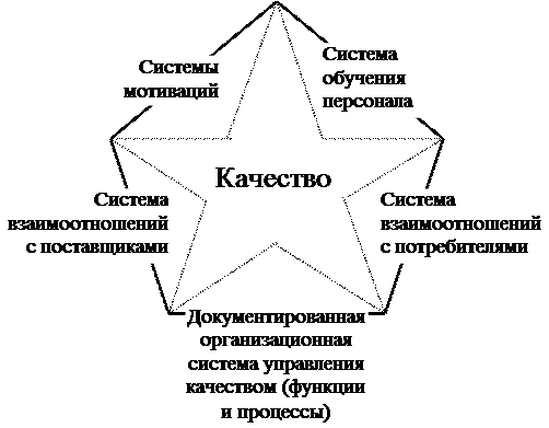 В основание звезды качества положим ту или иную систему управления качеством, соответствующую определенной концепции. Будем предполагать, что система эта документирована и охватывает организационную структуру управления предприятием, а также систему управления процессами создания продукции. Последнее очень важно подчеркнуть: мы рассматриваем организацию и как функциональную структуру, и как совокупность процессов.
