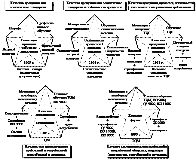 В истории развития документированных систем качества, мотивации, обучения и партнерских отношений можно выделить пять этапов и представить их в виде пяти звезд качества (рис. 2.6).