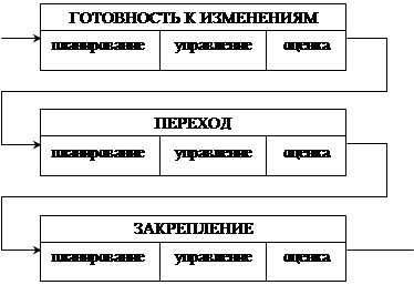 С точки зрения процесса управления предприятием каждый из приведенных этапов разделяется во времени на три этапа: планирование, управление и оценка. На рис. 2 представлена схема процесса организационных изменений.