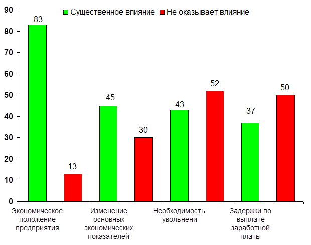 Влияние (как положительное, так и отрицательное) существующего экономического положения предприятия на работу с персоналом оценивают как существенное 83 компании. Еще 45 компаний понимают, что все процессы следует рассматривать в динамике. Далеко не лучшим образом сказывается на деятельности компании и сотрудниках необходимость увольнений и задержки по выплате заработной платы (в 43 и 37 компаниях соответственно).