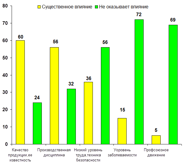 Общемировая тенденция снижения роли профсоюзного движения проявилась и в результатах данного исследования. Только 5 компаний заявили, что испытывают давление со стороны профсоюзов. Основная масса руководителей предпринимают шаги по недопущению деятельности профсоюзов не предприятиях. Но эти усилия, не подкрепленные мероприятиями по «индивидуализации» трудовых отношений выливаются в высокий уровень заболеваемости (15 компаний), низкий уровень условий труда, несоблюдение правил техники безопасности (36 компаний) и низкую производственную дисциплину (56 компаний). 60 компаний обеспокоены качеством производимой продукции, продаваемых товаров и оказываемых услуг.