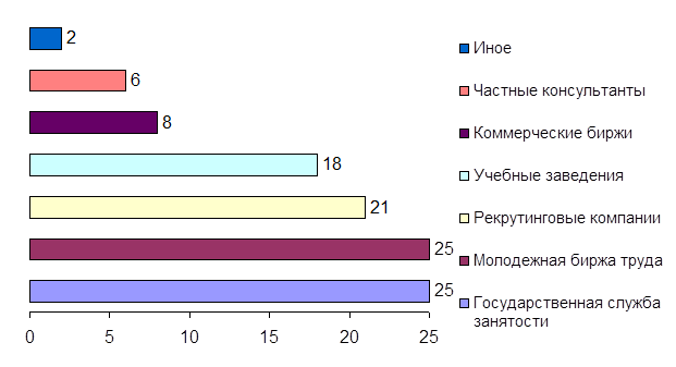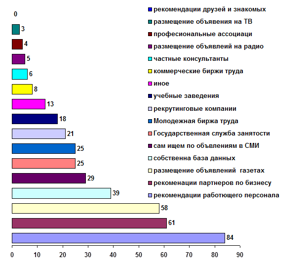 Радио и телевиденье практически не используются респондентами (5 из 3 случая соответственно). Чаще предприятия взаимодействуют с газетами, размещая объявления о вакансиях (58 респондентов) так как считают этот способ более эффективным, быстрым, хотя и чуть более затратным, чем поиск персонала по объявлениям типа «ИЩУ РАБОТУ» в газетах (29 респондентов).