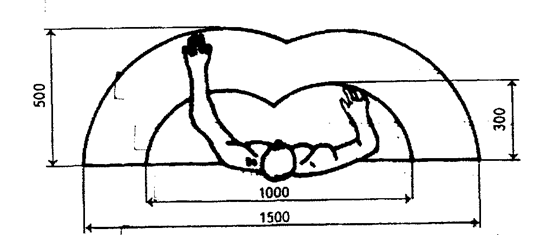 Нормальная рабочая зона в горизонтальной плоскости ограничивается воображаемой дугой, очерчиваемой концами пальцев правой и левой рук, согнутых в локтевом суставе при свободно опущенном плече. Такая зона занимает около 1000мм по фронту и 30 мм в глубину. Здесь располагаются наиболее часто используемые средства и предметы труда и выполняется основная работа. Максимальная рабочая зона в горизонтальной плоскости ограничивается воображаемой дугой, очерчиваемой концами пальцев полностью вытянутой руки человека. В этой зоне (работник действует вытянутыми руками) располагаются средства труда, используемые реже. Взаимно перекрываемая при этом площадь (для 2 рук) определяется дугой около 1500 мм по фронту и 500 мм в глубину. Обычно габариты стола принимаются несколько большими, чем максимальная зона досягаемости.
