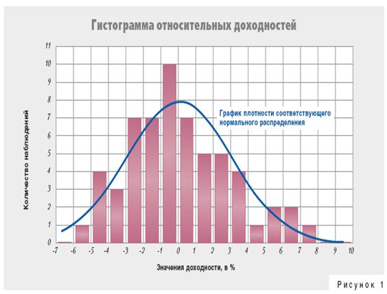 Основной этап в расчете значения VAR — определение распределения вероятностей доходности позиции. На основе данных за период с 1 января 1999 года по 1 декабря 2003 года (за весь период с момента ввода в обращение валюты евро) были рассчитаны ряды относительных доходностей вложений долларов США в евро на периоды, равные одному месяцу. Гистограмма полученного статистического ряда данных представлена на рисунке 1.