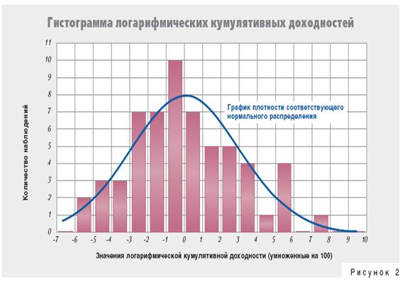 В частности, если использовать данные приведенного выше примера, параметры нормального распределения логарифмической кумулятивной доходности, приведенные к сопоставимому виду, то есть умноженные на 100, получаются схожими с параметрами нормального распределения относительной доходности (значения в скобках): среднее — 0,04 (0,08), среднеквадратическое отклонение — 2,96 (2,99). Для сравнения гистограмма ряда логарифмических кумулятивных доходностей представлена на рисунке 2.