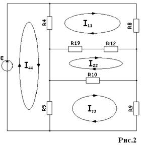 Для упрощения расчётов Pi резисторов R4, R5, R8, R9, R10, R12 и R19 преобразуем выделенную часть схемы рис.1 (только те ветви, на которых находятся вышеуказанные резисторы) в эквивалентную (рис.2). Рассчитываем токи в контурах эквивалентной схемы рис.2 методом контурных токов.