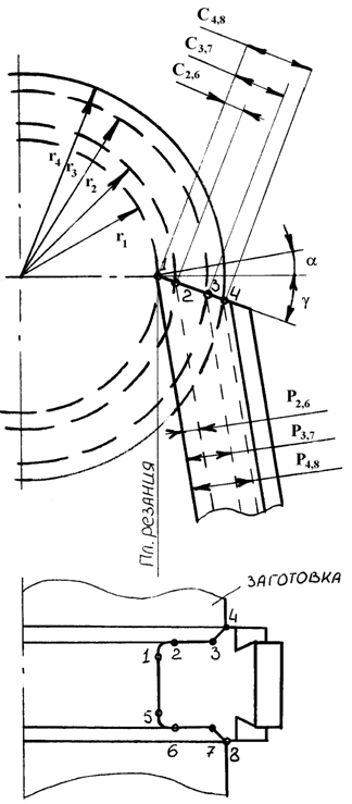 3. Целью коррекционных расчётов призматических фасонных резцов является вычисление расстояния от прямолинейной образующей точки 1 до параллельных ей образующих задней поверхности резца, проведённых через контурные точки 2, 3, 4, 5, 6, 7, 8, т.е. величин Р2, Р3, Р4, Р5, Р6, Р7, Р8.
