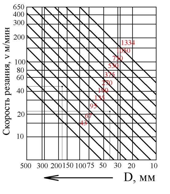 Лучевая диаграмма скоростей служит для быстрого определения n по заданным v и D.