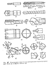 Применяются перовые сверла представляющие собой заостренную пластину с весьма несовершенной формой режущей части. Эти сверла применяются для обработки отверстий малого диаметра d=0,2 .1 мм, большого диаметра d>80 мм и при ремонте. Применяют составные перовые сверла в виде пластин закрепленных в державке. Обработка отверстий в стали, чугунах, легких сплавах и дереве при глубине l>10d проводят шнековыми сверлами с углом w=50 .65°.
