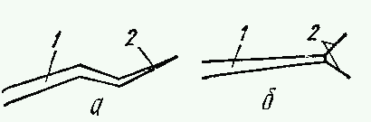 Рис. 5. Схема траектории (1) и распространение полос скольжения (2) в вершине трещины, растущей с припороговой скоростью (а) и скоростью, соответствующей среднеамплитудному участку кинематической диаграмме усталостного разрушения (б).