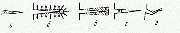 Рис. 7. Схемы механизмов закрытия трещины, обусловленных вязкостью рабочей среда (а), фазовыми превращениями в зоне предразрушения (б), ЗТП (в), ЗТО (г) и ЗТШ (д).