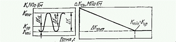 Рис. 8. Параметры цикла нагружения (а) и зависимости пороговых размаха коэффициента интенсивности напряжения (б).