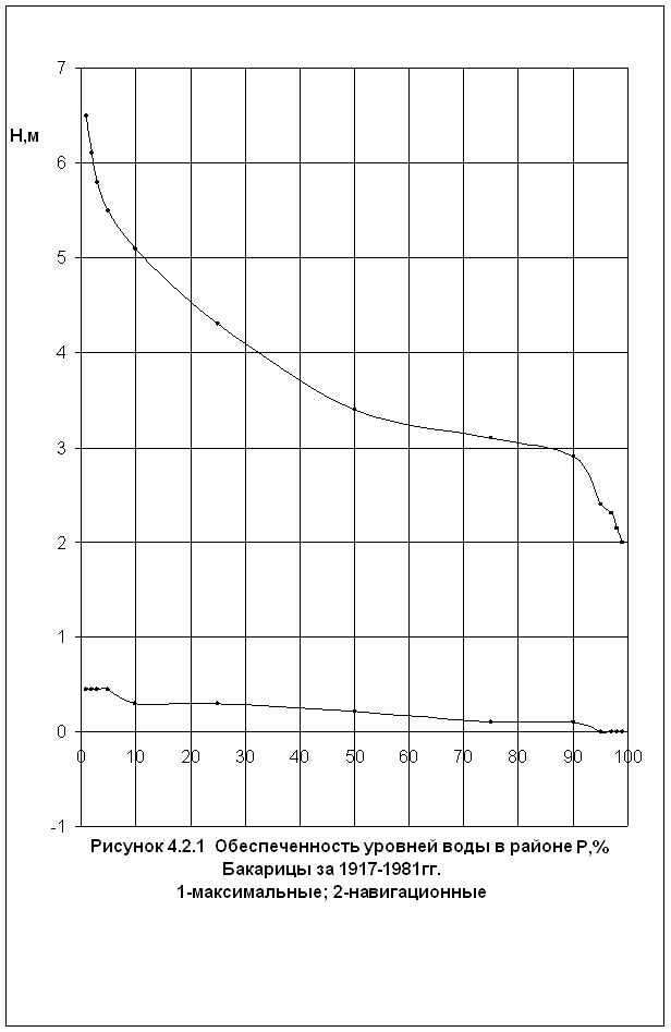 Обеспеченность характерных уровней воды на вод. пост Бакарица (максимального годового и минимальных навигационного) подсчитана за период с 1917 по 1981гг и приводится в таблице 4.2.1 и на рисунке 4.2.1