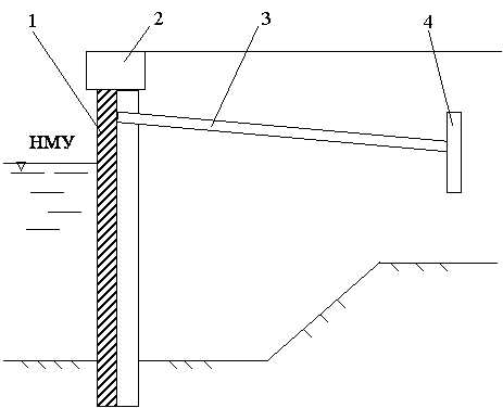 Рисунок 4.3.3. Заанкерованная тонкая стенка: 1-шпунт; 2- монолитный оголовок; 3-анкерная тяга; 4-анкерная опора