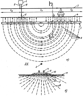 Рис. 2. Упрощенная картина распределения блуждающих токов вдоль электрической железной дороги и параллельно проложенного металлического подземного сооружения (а) и поперечный разрез на том же участке по 1—1 (б): 1 - преобразовательная подстанция; 2 — питающая линия; 3 — контактный провод; 4 — рельсы; 5 — отсасывающий пункт; 6 — отсасывающая линия; 7 — подземное сооружение (трубопровод, кабель); 8 — воображаемые линии блуждающих токов в земле; 9 — шпалы; 10 — балласт; 11- грунт |