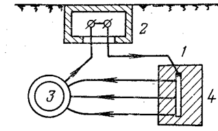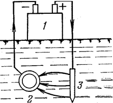 На рис. 3 изображена принципиальная схема катодной защиты проложенного в земле трубопровода. Устанавливаемая на земле катодная станция 1 (источник постоянного тока) соединяется отрицательным полюсом (катодом) с защищаемым трубопроводом 2 металлическим проводником и положительным со специально уложенным в земле металлическим электродом —— анодом (старые рельсы и т. п.). Под действием напряжения катодной станции постоянный ток проходит через анод — почву — трубопровод и возвращается по проводнику на катодную станцию. При этом анод разрушается, а трубопровод сохраняется. Для преодоления собственного потенциала стали — 0,76 В необходимая минимальная величина защитного потенциала составляет — 0,87 В (для свинца — 0,52 В и алюминия — 1,0В). Величина максимального защитного потенциала во избежание. отслоения защитного покрытия не должна превышать для стали с противокоррозионным покрытием —1,22 В и с частично-поврежденным покрытием —1,52 В.